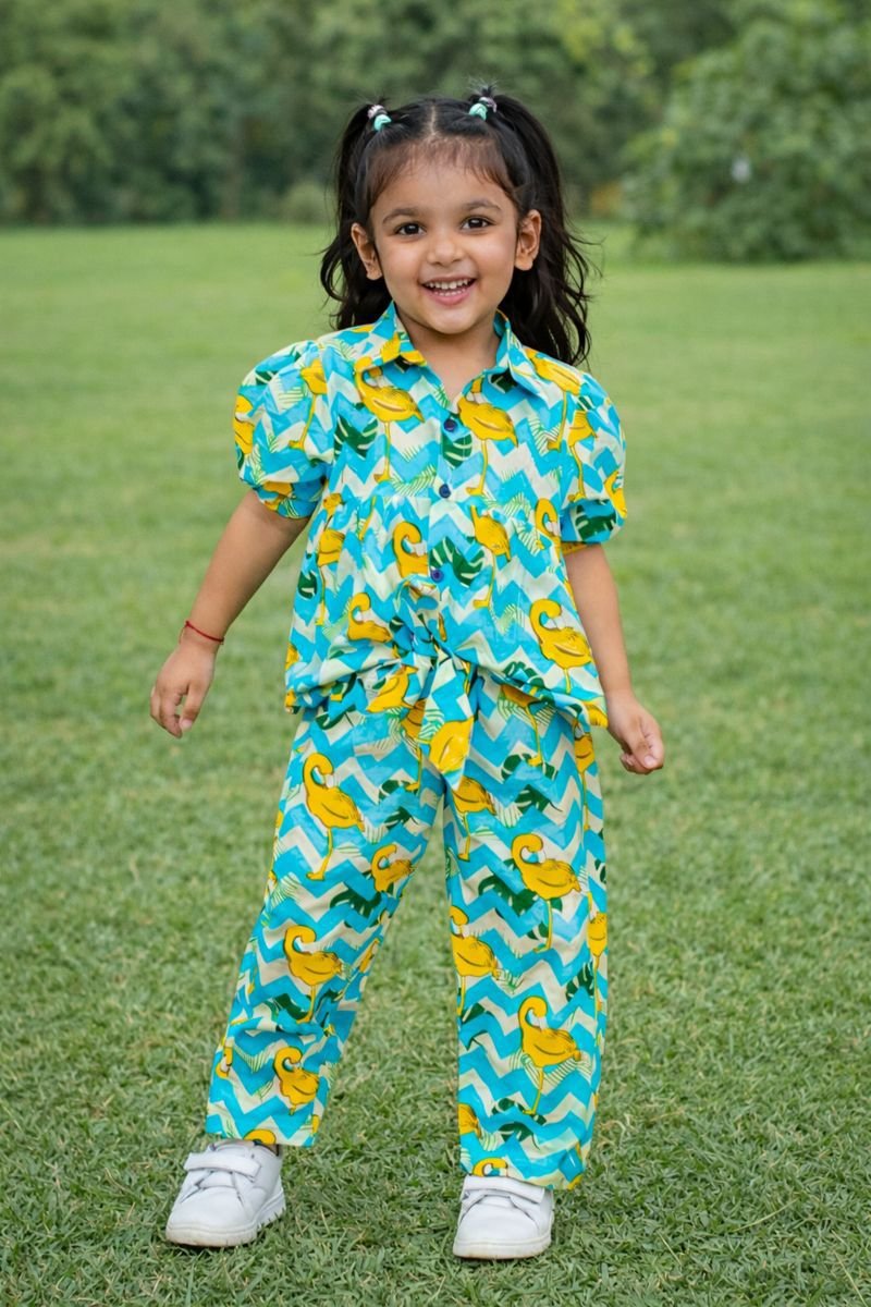 Step up your style game with the Girls Multicolor Printed Coordset! Crafted from 100% pure soft cotton, this coordset seamlessly combines comfort with elegance. The eye-catching multicolor swan blue design makes it an excellent choice for brunch outings or party celebrations, making your little one shine effortlessly.